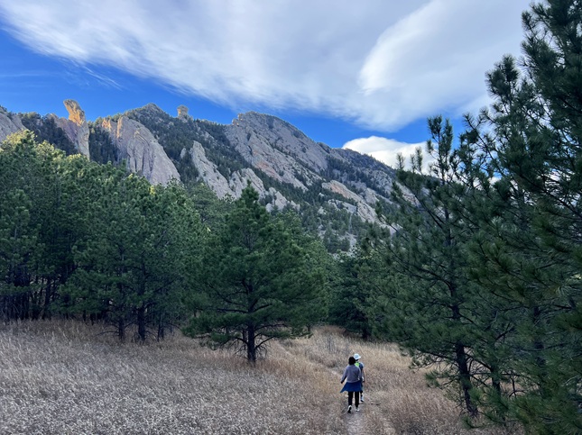 13) Chautauqua, Bluebell-Baird, Mesa and Enchanted Mesa Trails, Chautauqua trailhead, City of Boulder Open Space and Mountain Parks, Boulder, CO, April 20, 2025 - We did another spring hike with our friend Desiree but this time we chose to meet at Chautauqua instead of our usual hiking spot at South Mesa Trailhead. We met up in the late afternoon on Easter Sunday and hiked a short loop starting on the Chautauqua trail, then going along the front of the Flatirons along the Bluebell-Baird trail. We then continued south on the Mesa trail before turning back on the Enchanted Mesa trail to return to the trailhead. A 2.9 mile loop with 650 feet of elevation gain.