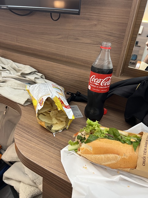 146) Reunification Express Overnight Train, Quy Nhơn, Vietnam, February 25, 2025 - The bus brought us to the Quy Nhơn train station. We got there 30 minutes before our train (which only stops at this station for about 5 minutes to unload and load passengers so we stayed in the lounge until the announcement to prepare. We were quite efficient and were settled into our car before the clickety-clack of the wheels could be heard. I had my lukewarm pesto fettuccine and cold cheesy bread, washed down with an "orange drink" (aka Tang) from the train station vending machine. Better than last night’s frozen veggie pizza but it is safe to say I was looking forward to more delicious Vietnamese food once we arrived in Ho Chi Minh city the next morning. As the train rolled down the tracks I spent some time trying to make a visible dent in the so called mattress on my sleeper car bed.