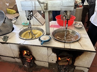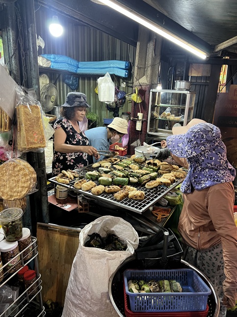 156) Scooter Food Tour, Sài Gòn, Vietnam, February 26, 2025 - What was also successful, as a lesson we learned after our food tour in Hanoi, was not to finish the food. Instead to share one portion or just eat half. The food is super cheap (maybe $1 per dish) and the vendors collect uneaten food to give/sell to farmers for animal feed so leftovers aren’t wasted. We took off for a much longer ride to our next stop. While Rachel and Jonna went straight to the next street food vendor Daniel veered us over to a street corner where four women were cooking sticky rice on a big rolling grill. From the seat of his scooter, with me sitting on the back, he ordered two which the ladies popped straight off the grill and into a to-go box which they handed us and off we went. Probably took about 20 seconds total.