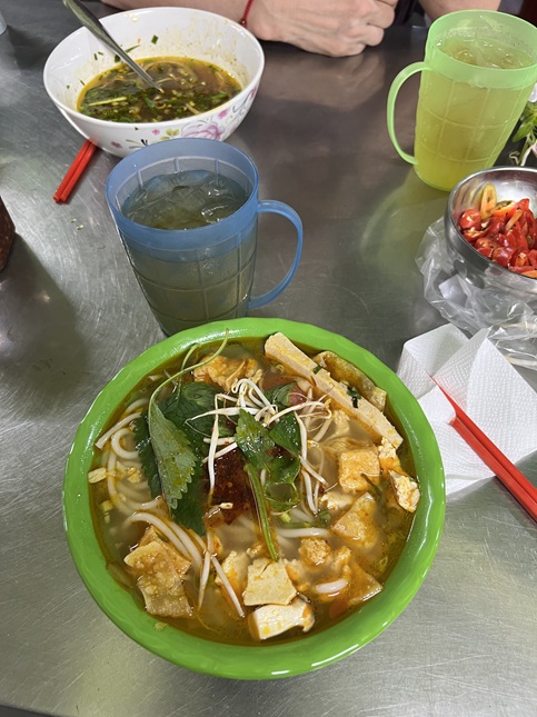 157) Scooter Food Tour, Sài Gòn, Vietnam, February 26, 2025 - We caught back up to Rachel and Jonna then sat down at a table behind a busy food cart. The specialty here is beef stew. While Daniel ordered for Jonna, Rachel took off for a neighboring cart that makes a vegetarian version using tofu instead of beef. This stew was both Daniel and Rachel’s favorite dish so they ordered bowls for themselves as well. This meant we lingered and started a very enjoyable conversation with them both and over the following couple of hours had the opportunity to get beyond pleasantries and to learn about them both. On top of that, the stews were delicious! The broth is made with cinnamon, cardamom, star anise, spring onion, carrots, and more. Fresh green herbs, bean sprouts and hot chilies are added to taste. I stuck to the plan to just eat half but it was very hard to push the soup away.
