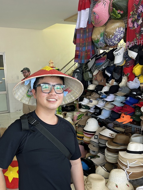 166) Bến Tre Islands Tour, Bình Đức, Vietnam, February 27, 2025 - I was pretty sleepy when Jonna prodded me out of bed for breakfast. We had a simple breakfast at the hotel that was a cross-cultural mix of eggs and noodles. We then checked out of our room and dropped off our luggage to be stored in the luggage storage area while we boarded our bus for an overnight excursion. The traffic was again jaw dropping and it took is an hour to get out of Ho Chi Minh City and into the rural area to the south. Our destination was the Mekong River Delta. It was another hour drive to the city of Mŷ Tho. From there we boarded a tourist boat over the Tien Giang branch of the Mekong River to Unicorn Island. While we waited for our boat, our guide Menh modeled the hats for sale in the ticket office.