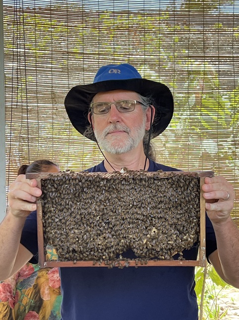 169) Thoi Son (Unicorn Islet), Bến Tre, Vietnam, February 27, 2025 - Then on to station #3 which was bee-keeping. A frame of bees was brought out for a photo op and we were offered a small cup of honey tea. As we sipped, out came the selection of honey products and a sales pitch.