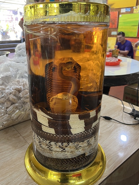 172) Con Phung (Phoenix Islet), Bến Tre, Vietnam, February 27, 2025 - The final stop in the market was the rice wine (basically moonshine) area where cobra snakes are pickled in rice wine then shots are sold to provide men with "vitality". A version for women is made with bananas in place of the dead reptile. It felt gimmicky to me but then again no culture has ever failed to find a market for something that convinced old men they are still young so maybe it is common in back alleys and smokey bars.