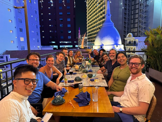 182) Sài Gòn, Vietnam, February 28, 2025 - We were both pretty tired once we finished at the museum and with the afternoon temperature in the upper 80s (with the ever present high humidity) we decided that a ride share was a much better idea than the long walk back to the hotel. Even with it being afternoon rush hour the traffic wasn’t too bad and we made it back around 4:15pm. Plenty of time to shower, change into clean clothes, stuff the Thank You envelope with our freshly withdrawn cash and get down to the lobby by 6:15pm to meet our tour group for the final time. We made a 1 mile walk into the fancy shopping district where we found a nice rooftop Vietnamese Fusion restaurant for our Farewell Dinner. Memories of the last two weeks were shared, jokes were told, appreciation speeches were given and a good time was had by all. The food and drinks were all good but the service was terrible so a bit of a mixed bag.