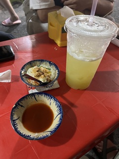 158) Scooter Food Tour, Sài Gòn, Vietnam, February 26, 2025 - To go with the soup we had chilled unsweetened jasmine tea. Again very refreshing. One sad bit that will be a lasting memory was a super cute orange tabby kitten that was sleeping next to our table. The kitten had been hit by a scooter last night and apparently had a broken leg. It had a little homemade neck "cone" on so hopefully that meant it had been seen by a vet but no cast or visible sign of treatment. I wanted to cradle the little cutie and protect it from the chaotic world it must survive in. After the stew Daniel pulled out the sticky rice he’d bought. It turned out to be chunks of banana, encased in sticky rice and then grilled over a wood fire. A sauce was then made from coconut milk thickened with tapioca powder. The cooked rice, the banana and the coconut mill combined to give it a rich, sweet flavor. Very nice!