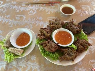 175) Con Phung (Phoenix Islet), Bến Tre, Vietnam, February 27, 2025 - There were three vegetarians in our tour group so we often got platters of food just for us. Here are the vegetarian spring rolls and the banana flower fritters. At least I got my recommended daily serving of fried food!
