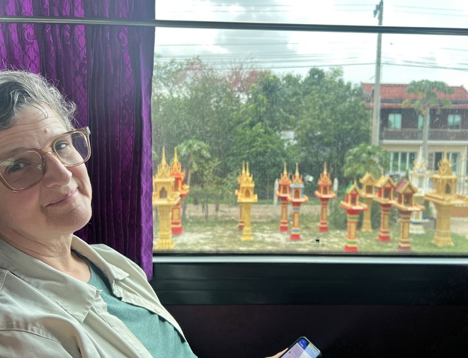 188) National Highway 1, Soeng Village, Cambodia, March 2, 2025 - We drove for about two hours and then the bus stopped at a truck stop so we could use the restroom and buy snacks. (The bus service provided a croissant and a bottle of water in the morning and a cold can of coffee latte in the afternoon.) The rest stop provided me a chance to look at Cambodian snacks and that was also different. Fewer packaged/processed goods and more natural or baked goods - cashews, dried fruits and homemade crackers seemed to dominate. We were back on the bus for another two hours after then break which put us into Phnom Penh around 4pm. I checked my weather app as we pulled into town - 91 degrees F and 91% humidity. Ooof! The bus dropped us off at the central bus terminal where we immediately hopped on a smaller tourist bus for the trip to our hotel.