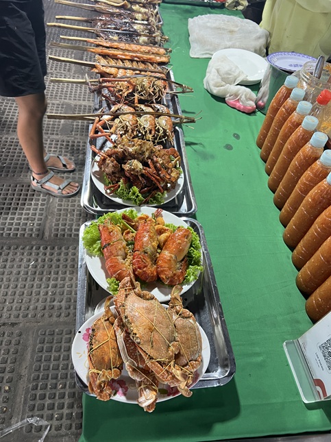 212) Phnom Penh Night Market, Phnom Penh, Cambodia, March 3, 2025 - After the cruise Jonna and I decided to walk back - about 20 minutes. Along the way we found an Indian Restaurant - perhaps of questionable quality. The food tasted good but there were also some signs that maybe it wasn’t the best place. Thankfully, we didn’t get sick and regret our dinner choice. At least the price was right - $12 for a dinner for two. Just around the corner from the restaurant was the night market. It was gritty and dirty but also a very local part of Phnom Penh in contrast to the tourist areas. We also stopped en-route at a convenience store where I got snacks for tomorrow and an ice cream bar for tonight. We got back to the hotel around 8:30pm which gave us time to pick up the laundry we’d sent out yesterday for cleaning and to shower off the sweat and bug repellent from today. Tomorrow we leave the capital to see some of central Cambodia.