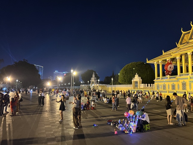 198) Tuk-Tuk Tour, Royal Palace Park, Phnom Penh, Cambodia, March 2, 2025 - One thing that stood out in Independence Park is how Cambodians come out at night to enjoy large communal spaces. There were kids playing soccer, families having picnics, young adults strolling in little groups, tuk-tuk drivers lolling about chatting. It is so intensely hot during the day that the cool of the evening is when people socialize. Then we got back in the tuk-tuks for the final leg of our tour - to the Royal Palace Park. As the name suggests this is a large park directly in front of the Royal Palace where the current King lives (Note: the King is ceremonial in nature, like the Royal family in England. Political power rests with a democratically elected Prime Minister who is always from the dominant Communist Party - though technically there are something like 16 other small parties which play minor roles in politics.) The roads in front of the Royal Palace are closed to motorized traffic every evening and the second tier roads around the park are closed on weekends so tonight it was a big pedestrian place that was lovely to walk around in. Thousands of people out strolling with lots of polite laughter and singing and lively conversation. All while colorful lights and little children’s toys and tiny dogs and kids on bicycles (or miniature electric cars) zoomed around. The most obvious feeling is how much smaller Phnom Penh is than Hanoi and Ho Chi Minh City. HCMC is around 13.1 million people. All of Cambodia is 16 million and Phnom Penh is around 3.5 million. Big by the standards of most US cities but spacious compared to Vietnam. And the people are quite happy - some surveys rank Cambodians in the top of the happiest people in the world. So the atmosphere was really light and friendly. (That said, guide books warn that minor crime like purse snatching, pick pocketing and money scams are common so happy or otherwise we still kept a firm hand on our bags.) We walked the length of the park and then found a restaurant that could accommodate all 16 in our party. The food was good and while it was expensive compared to Vietnam it was still cheap by US standards. I had a vegetarian version of the national dish and Jonna had a papaya salad. Add a bottle of water for Jonna and a fruit smoothie for me. The total was $17.75. Oh, and the total was in US Dollars because Cambodia is dual currency. The official currency is the Khmer Riel but most prices are listed in US dollars since that is the preferred currency. We celebrated the birthday of one of our tour members but the called it an early night when the table next to us fired up the karaoke machine. Four of us walked to the edge of the pedestrian mall and found a tuk-tuk driver who said he’d bring us to the hotel for $3. But once we started driving it became clear that a) he was drunk and b) he had no idea where our hotel was. Jonna managed to use Google maps to navigate him in the right direction from the back and once we got close we had him drop us off. We walked the rest of the way and chalked it up to a travel adventure.