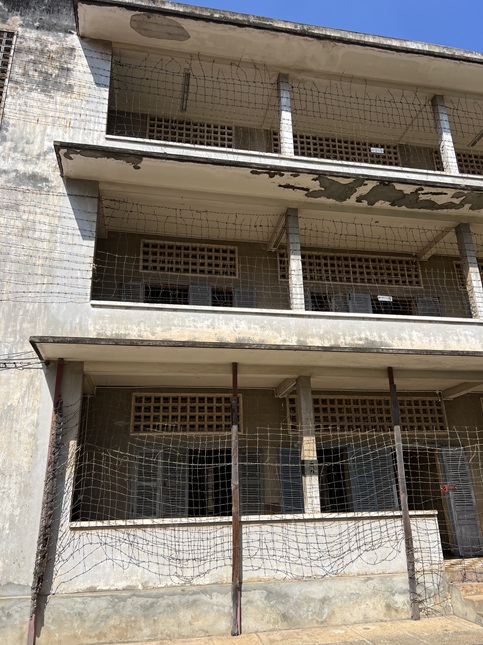 200) Tuol Sleng Genocide Museum, Phnom Penh, Cambodia, March 3, 2025 - Today, as expected, was a heavy one. We started easy enough sleeping in until 7:30 and then grabbing the usual hotel breakfast. Most of the options are Cambodian food so fried noodles, fried rice, rice soup, stir fried veggies and fruit. The fruit juice was currant juice which was a new choice. After breakfast we met up in the lobby to board a bus for our visit to the Tuol Sleng Genocide Museum, commonly known as Security Prison 21. When the Khmer Rouge took control of Cambodia in 1973 they emptied out all the cities forcing all the population into the rural areas to farm. The idea was to create an agrarian society where everyone was the same. However, the second way to achieve that end was to kill all the intellectuals. What had been a large high school in Phnom Penh was converted into a prison. Doctors, teachers, business people, members of the Cambodian Army and anyone who disagreed with Pol Pot’s philosophy were brought to one of 164 security prisons spread around the country. In these prisons they were interrogated about what then had done before, what they believed and who they knew. Accusations and charges were made and then torture used to get confessions. After 2 to 4 months in the prison the "criminal" was brought out to one of over 300 extermination centers where they were executed and buried. Records were kept of everyone detained (though some of the records were destroyed in 1979 as the Vietnamese Army captured most of Cambodia and pushed the Khmer Rouge into the mountains along the border with Thailand. This extermination system, combined with mass starvation when the agriculture plan proved insufficient to feed the population, resulted in around 3 million people (one quarter of the entire population) dying in just three years. Security Prison 21, previously Tuol Svay Prey High School, was believed to have had approximately 20,000 people pass through over three years. It is now a UNESCO site to preserve this tragic place for posterity - there is much to learn here but the lesson is difficult.