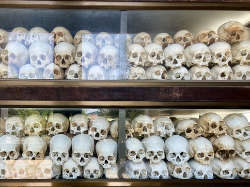 207) Choeung Ek Genocidal Center, Phnom Penh, Cambodia, March 3, 2025 - It is estimated that about 20,000 people were killed and buried at this site. The entire field is filled with burial pits but only about half the site has been excavated. The remains of 8,895 were found at that time but bones, clothing, personal items and killing tools continue to be found after rain storms or as walking paths within the site wear down the ground. We saw a few different places where these items have been collected as they are found. Pieces of clothing were visible sticking up out of the dried mud at various places as we walked through the site. It is raw and sickening to experience. A few of the pits have been fenced off and have descriptions to help understand what you are seeing but at any point you look across the field and can see all the undulations that indicate just how many mass graves are at this site.