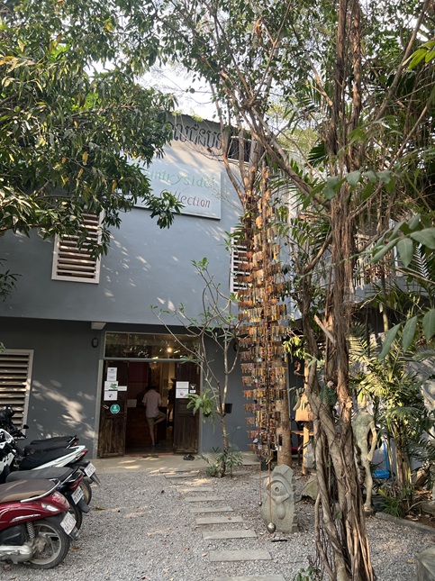 217) Romcheik 5 Artspace & Café, Battambang, Cambodia, March 4, 2025 - Then we were back on the bus for a short drive to a restaurant for lunch. A boring sandwich for me but Jonna got a soup that she said was perfect. After lunch we had another two hours on the bus to arrive in Battambang. This is the second largest city on Cambodia but at 1.5 million inhabitants it feels small compared to most of the places we have visited. I checked my weather app as we pulled into town at 3pm - 98 degrees and 43% humidity. Sweltering! We checked into our room but then decided to brave the heat to walk to Romcheik 5 Art Space Cafe which our guide had recommended. Good call! We walked through the grounds of a Buddhist temple on the way there and then found the Art Space was a gallery with three floors of contemporary Cambodian art. After the two art museums we saw in Vietnam that were both heavily curated to provide a propagandist message it was refreshing to see art work that seemed much freer in expressing political, social and cultural messages. We particularly enjoyed the work by Hour Seyha which was in both their regular display gallery and as a featured artist in their temporary gallery. The art in the galleries was both larger and more expensive than made sense for us to buy while traveling but we did buy a smaller piece by a local artist that was on display in the attached cafe. We walked back on a different path through the temple and got back just in time for our evening outing with the tour group.