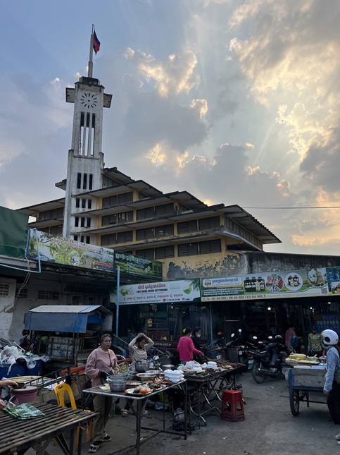 218) Tuk-Tuk Tour, Battambang Central Market, Battambang, Cambodia, March 4, 2025 - This was a two hour tuk-tuk tour of Battambang. Traffic was nearly at a standstill as kids leaving school and people getting off work clogged the road beside the Sangker River. It took a little while but we eventually made it to Psar Nat - the Central Market. This was another French building (the French basically forcibly moved the traditional open air markets into enclosed European style markets) built in the 1930s. It had not been as well maintained as the one in Phnom Penh and looked pretty run down from the outside. Nonetheless, it still functions so we walked through to see it. Along the way we got to taste some traditional Cambodian foods - a desert made from coconut milk, palm sugar, tapioca, and lotus seeds.