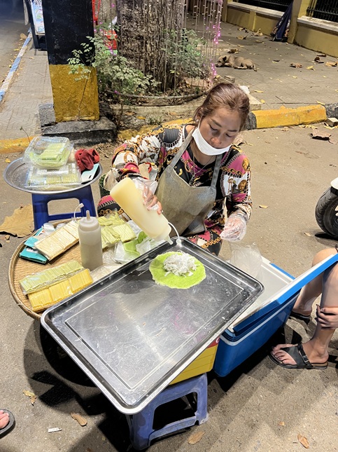 227) Tuk-Tuk Tour, Governor's Residence, Battambang, Cambodia, March 4, 2025 - Then, for our final stop, we drove to the Governor’s Residence. It was closed but we got to see the architecture (it was built in 1905 by an Italian designer) and hear why it isn’t particularly liked by the locals (it was the house of the Thai governor during a time when this province was under Thailand’s control). The best part of this stop was the woman sitting on a tiny stool with a cooler next to her. We asked our guide and she said the woman was selling coconut cakes. We went over to her and got a huge smile in return. To reciprocate we bought one and watched her make it: a thin crepe made from ground yucca. Then a big handful of chilled coconut. Normally, there would be a tablespoon of sugar but we waved off that part. Then a healthy dollop of coconut milk and about a tablespoon of ground sesame seeds. The crepe is then folded like a mini-burrito. It cost all of $.50 and proved Jonna with a sugar-free desert later in the evening. Finally, the tuk-tuks brought us back to the hotel. It had cooled off considerably in the evening so two hours out in the city wasn’t too bad but once Jonna and I walked into the air conditioned hotel room we knew we were done for the night. We ordered room service ($18) and called it a night.