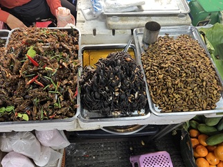 192) Tuk-Tuk Tour, Phsar Thum Thmei (Central Market), Phnom Penh, Cambodia, March 2, 2025 - Every culture has their food that is very different from what we usually encounter it the "west" and Cambodia has inexpensive protein in the form of insects, arachnids and larvae. This booth had crickets, tarantulas and grubs. Not gross but definitely different.