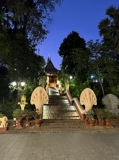 239) Pub Street, Siem Reap, Cambodia, March 5, 2025 - We had 1 1/2 hours before boarding a bus and I thought the guide may have to drag me kicking and screaming from the air conditioned room but I managed to rally in time to pack and check out. We had skipped lunch so I hit up the poolside bar for a soda and that helped spark me awake for the three hour bus ride. The three hour bus trip from Battambang to Siem Reap was uneventful and we rolled into Siem Reap at 5pm. Our first stop, before going to our hotel, was the ticket office for the Angkor sites. These sites are the reason little Siem Reap (500,000 inhabitants) is the most visited place in Cambodia and they have built a big, modern tourist center to handle selling the tickets. We picked up our tickets which required the official taking our photo - the ticket is valid for three one day visits anytime over the next ten days. This means we can use it with the tour for the next two days and still have one more day for the two extra days we are spending in Siem Reap. Score! Next was the drop off and check-in at the hotel. We got situated in our room and then headed back down to join our tour guide for a short walk around the tourist area. We visited Wat Preah Prom Rath which is a large Buddhist temple in the middle of Siem Reap. The temple buildings were closed but we could walk around the grounds. Next we walked over to Pub Street which is right next door to the night market but is a huge contrast since it is a brightly colored row of bars and restaurants packed with tourists. The group decided to stop at one of the restaurants there for dinner but Jonna and I decided we would try something a little smaller so we peeled off and went our own way. We had read a positive review for Tevy’s Place and based on the people waiting to get in it appeared to live up to the reputation. We sat outside in the heat for 20 minutes but eventually got seated inside. The food was very good and based on the reviews I felt safe ordering raw vegetables meaning I had an excellent green salad - something I’ve been missing for the past three weeks. After dinner we walked back to the hotel - it was still hot and muggy out - where we turned on the air conditioner and headed straight to bed. We have a very early morning tomorrow so I was thankful to nod off quickly!