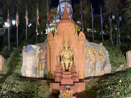 194) Tuk-Tuk Tour, Wat Phnom Daun Penh (Mountain Pagoda), Phnom Penh, Cambodia, March 2, 2025 - From the market we got back in the tuk-tuks for a drive to the Yeay Penh Statue. This monument tells the mythic founder of the city and there are decorations around the monument telling the story of the magical discovery of some statues which caused the building of a hilltop temple which then grew into Phnom Penh. Across the street from the statue is the temple of Wat Phnom - the modern temple built in the location of the one from legend. It is a beautiful building with typically elaborate decorations and statues which typify Cambodia temple architecture. The inside of the temple was closed for the night but we could walk around the building and see some of the outside shrines. We also got to watch the flying fox fruit bats flying through the garden surrounding the temple. The bats have wingspans a few feet across so very cool to see arcing overhead.
