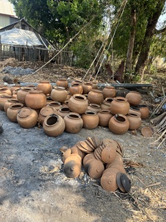 214) ពូមីងធ្វើឆ្នាំង (Pottery House), Khum Srae Thmei, Cambodia, March 4, 2025 - p Behind her studio she has a "kiln" area where she builds a big fire to bake the pots. There is no kiln structure just a big bonfire built on top of a stack of pots. She can make about 10 bowls a day and each sells for $1.