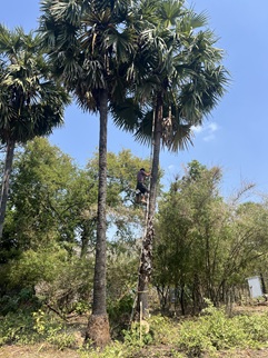 216) ពូមីងធ្វើឆ្នាំង (Pottery House), Khum Srae Thmei, Cambodia, March 4, 2025 - p The husband scaled a set of 30 foot high palms to show how he harvests the palm juice. They also showed us traditional music instruments and an old design for wooden cow "bells". It was a great side trip and they seemed like a very sweet family.