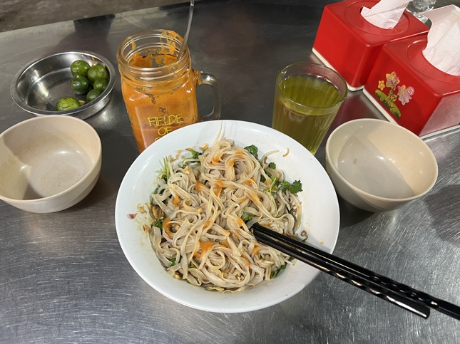 16) Hanoi Street Food Tour, Hanoi, Vietnam, February 12, 2025 - Then our next stop was green papaya salad accompanied by lemon tea and green tea for drinks. This was so delicious that we ended up coming back to this food cart two more times over the next week to get more!