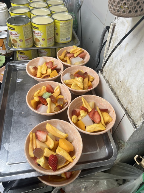 23) Hanoi Street Food Tour, Hanoi, Vietnam, February 12, 2025 - When we left there we waved the white flag of culinary surrender but Tony tempted us with fresh fruit for a desert. We found a side alley with a shop specializing in fresh fruit in a sweetened condensed milk sauce. No wafer thin mint was offered but we were definitely doing our impression of the famous Monty Python gourmand at that point. We chose to walk back the 2 miles back to the hotel just to aid our digestion. We next day we had a day long walking tour scheduled with Tony. Thanksfully, we didn't explode during the night from overeating and even more thankful that we didn't get sick because we broke all our long held travel rules – never eat uncooked greens, never eat unpeeled fruits and veggies, never have ice, avoid street vendors serving seafood, don’t use utensils and serving dishes stacked at tables. We did all of that – At some point I thought I might as well lick the table cloth because I’d broken every other hygiene rule for safe travels! Still, it was a tasty tour and we dodged the bacteria bullet. With our hotel room safe for the night we settled in for a full night's sleep to get us ready for an early start in the morning. I think we had a terrific first day of our exploration of Vietnam.