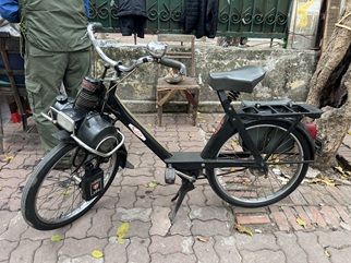 33) Hồ Tròn Bách Thảo (Hanoi Botanical Garden), Hanoi, Vietnam, February 13, 2025 - But visiting the garden meant we walked past a little restaurant that we decided to try for lunch and that turned out to be a good choice. A veggie banh mi sandwich for me and chicken phó for Jonna. The place also made fresh fruit smoothies, fresh squeezed sugarcane juice, hacked open coconuts and other interesting drink options but we were so thirsty from walking in this humid weather we opted to just drink bottled water. There was also a perfectly restored motorized bicycle parked in front of the cafe that I thought looked particularly interesting.