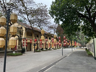 36) Hoàng Thành Thăng Long (Imperial Citadel of Thang Long), Hanoi, Vietnam, February 13, 2025 - The main boulevard running from the south gate through the middle of the Citadel complex was brightly decorated but also showed the distinctly Chinese aesthetic which is unusual in modern Vietnam which is now more closely aligned with Russia than China.