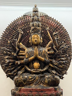49) Bảo Tàng Mỹ Thuật Việt Nam (Vietnam National Fine Arts Museum), Hanoi, Vietnam, February 15, 2025 - We have have seen one or two pieces of silk painting and lacquer painting at other museums but in this museum there were multiple rooms dedicated to each. I can’t say it is necessarily unique to Vietnam but it felt that way since we saw so many different styles of each. The themes of the art made it very clear just how much the wars of Independence against first the Chinese, then the Japanese, then the French and finally the Americans have forged the national identity if the Vietnamese people. Most of the contemporary art in the museum references those wars in some way. A picture of a NVA or Vietcong soldier is presented with the same mythic messaging that a painting or sculpture of David & Goliath would represent in Western culture. I joked with Jonna that we could play "Where’s Waldo" with the artwork trying to find the soldiers in each one. The lacquer paintings were also quite interesting. I am very familiar with lacquer art where art is painted on something and then covered with clear or tinted lacquer as a protective cover but this art was using lacquer like oil paint with different pigments blended into the lacquer and then applied like paint. Many other techniques could then be applied like scraping or etching or even adding actual paint on top of the lacquer. The end result was lots of unique looking art. The silk painting was also beautiful since the paint put onto silk cloth is absorbed resulting in a diffuse or fuzzy look, kind of like water color painting. My favorite though was a bigger than life-size Buddhist statue of the Bodhisattva Avalokitesvara with carvings to represent the usual description of this Lord of Compassion having a thousand eyes to see all the pain in the world and a thousand hands to reach out to help. A beautiful representation of a much needed sentiment right now.